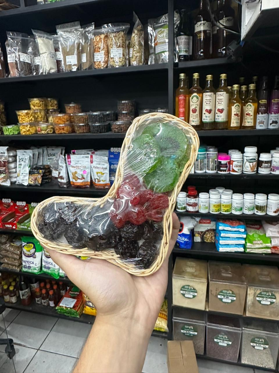 A Cestinha em Formato de Botinha com Frutas Glaceadas e Secas é uma opção charmosa, criativa e cheia de sabor, perfeita para presentear em datas especiais e encantar à primeira vista. Com um visual delicado e uma combinação equilibrada de sabores, ela une o doce natural das frutas secas ao toque especial das frutas glaceadas.