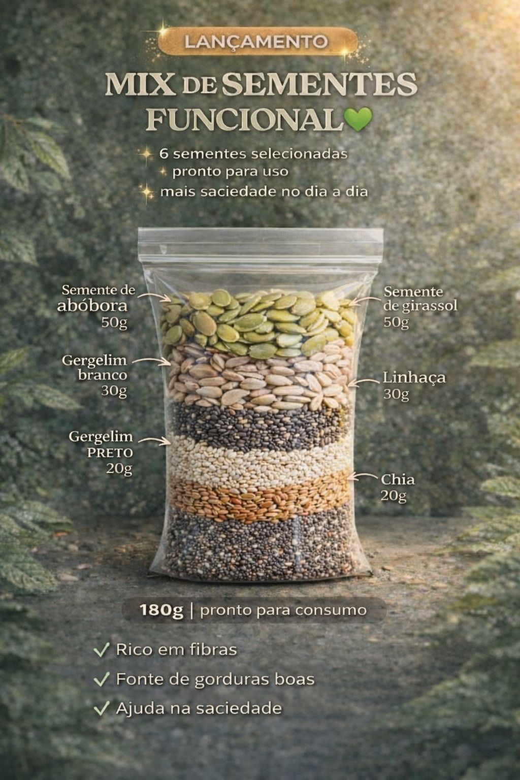 Selecionamos sementes naturais que, juntas, ajudam na saciedade, na digestão e no equilíbrio da rotina alimentar 💚